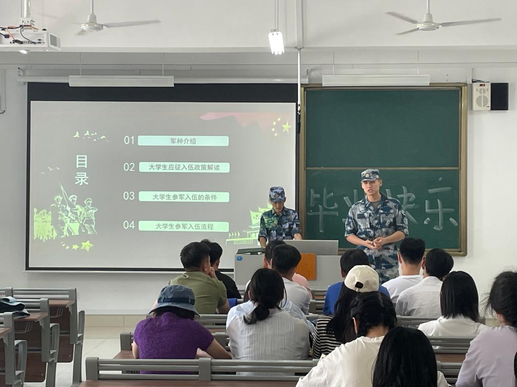 本次会议从军种介绍、大学生应征入伍政策解读、大学生参军入伍的条件以及大学生参军入伍流程四个方面进行介绍,向同学们解释了此次征兵的意义及相关优惠政策。何金泰与刘屹向同学们讲解了大学生入伍条件的三个基本要求:一是年龄要求。二是身高、体重、视力基本身体条件要求,以及征兵体格检查的主要内容。三是基本政治条件。宣讲最后他们说到,保卫祖国抵抗侵略是中华人民共和国每一个公民的神圣职责,依照法律服兵役和参加民兵组织是中华人民共和国的光荣义务。