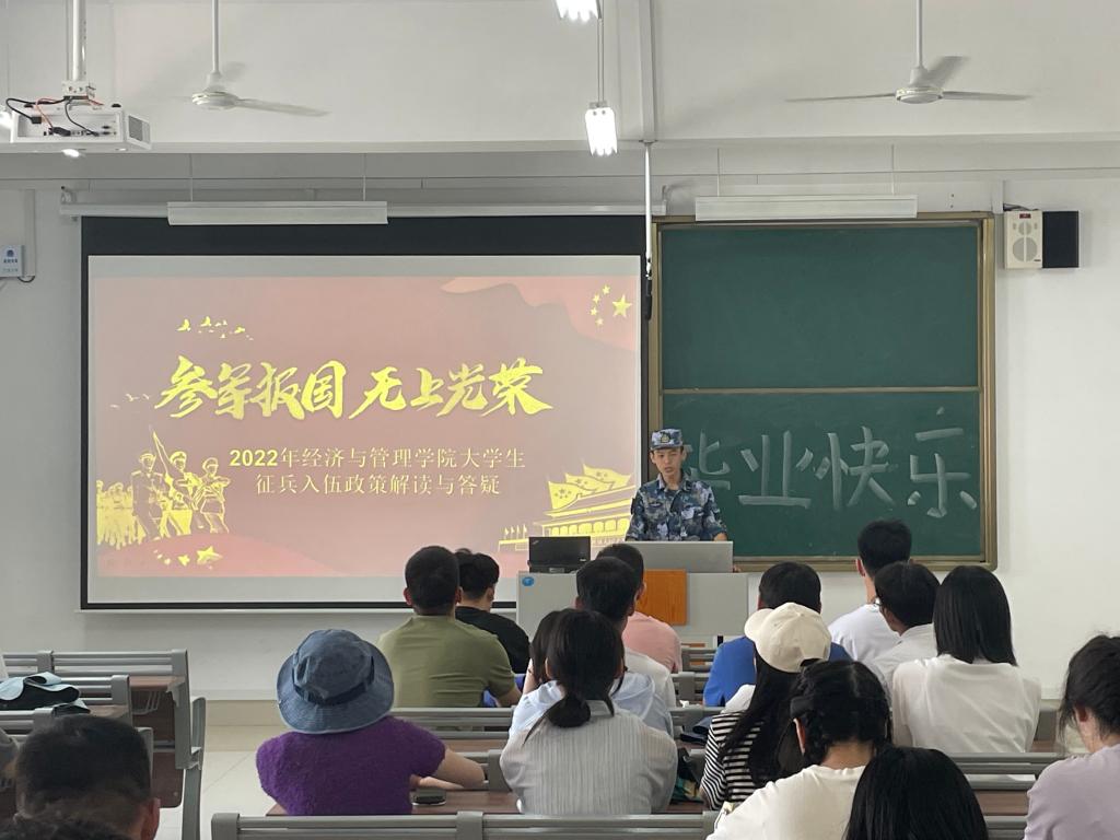 2022年下半年征兵报名已经开始,为使我院学生及时了解征兵的政策规定、程序规范,6月8日,yl9193永利集团在增信楼报告厅开展了2022年大学生征兵入伍政策解读与答疑主题班会,本次会议由学生会国防武装部何金泰、刘屹主讲,2020级市场营销升本一班、升本二班同学参加。