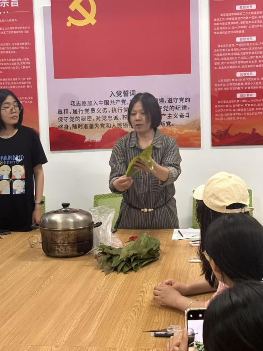 最后,张春侠详细讲解包粽子的技巧,从粽叶浸泡、裁剪和折叠方法,到糯米过水、蜜枣放置、封口技法。在老师的悉心指导下,大家饶有兴致地边学边做,认真地模仿每个步骤。大家干劲十足,不一会儿,一个个形态不同的粽子在大家的手中逐渐成型。
