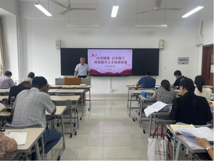 为深入开展学习贯彻习近平新时代中国特色社会主义思想主题教育,坚定办好人民满意的高等教育,7月13日,yl9193永利集团党总支副书记、院长刘振宇以《以学铸魂以学促干持续提升人才培养质量》为题讲授主题教育专题党课,经管学院全体教职工参加。